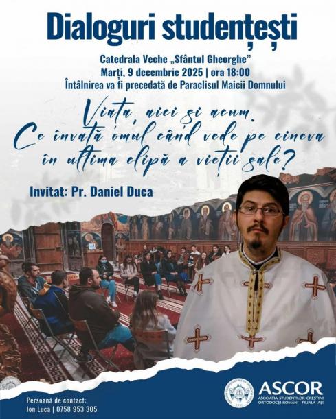 Asociația Studenților Creștini Ortodocși Români – Filiala Iași organizează dialogul studențesc cu tema: „Viața, aici și acum. Ce învață omul când vede pe cineva în ultima clipă a vieții sale?”. Evenimentul va avea loc la Catedrala Veche „Sfântul Gheorghe” din Iași, începând cu ora 18.00. Invitatul acestei ediții este părintele Daniel Duca, care va purta un dialog deschis cu participanții pe tema sensului vieții, a prezenței celuilalt și a înțelegerilor care se nasc în momentele limită. Întâlnirea își propune să ofere un cadru deschis pentru reflecție, împărtășire și întrebări legate de experiența limitei și sensul profund al vieții trăite în prezent.
